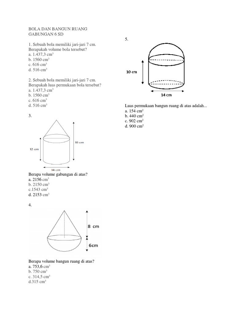 Contoh Soal Volume Bangun Ruang Gabungan Kelas 6 Diary Guru from 1.bp.blogspot.com Volume gabungan bangun ruang di atas adalah. Simak kumpulan contoh soal volume bangun ruang sd untuk level kognitif penalaran dalam kisi. Volume limas = 1/3 luas alas x tinggi luas permukaan = jumlah luas alas + jumlah luas sisi tegak. Volume gabungan bangun ruang = volume tabung + volume kerucut = 12.320 + 3.080 = 15.400 cm 3. Untuk itu cara menghitung volume bangun ruang gabungan tersebut dapat menjadi seperti di bawah ini: Bangun ruang atau biasa disebut juga sebagai bangunan tiga dimensi merupakan jenis bangun yang memiliki ruang serta sisi sisi yang membatasinya. Bangun kelima yang diberikan di sini merupakan bangun ruang yang terdiri dari setengah bola dan tabung. Balok mempunyai unsur, sifat, rumus luas permukaan, bidang diagonal, volume, diagonal ruang, dan diagonal bidang.