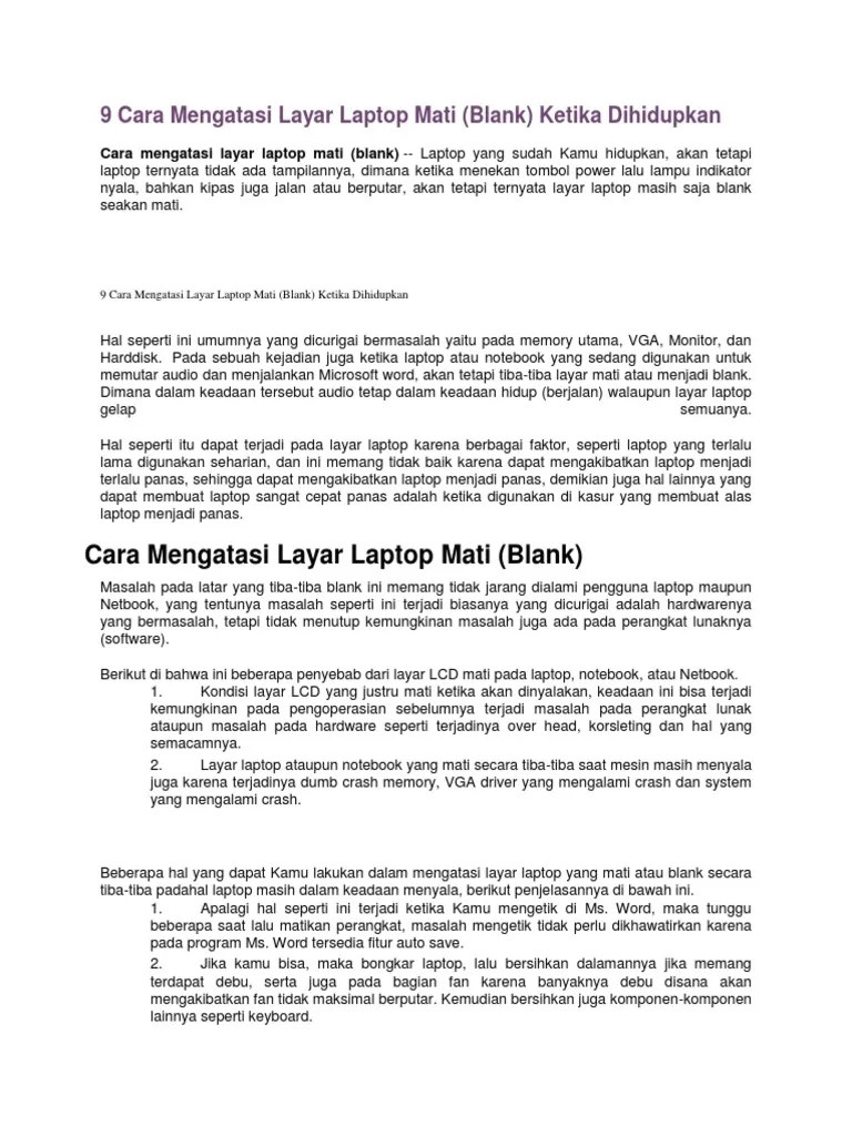 Pertama, coba tahan tombol daya pada ponsel selama 5 . Ketika dinylakan menggunakan remot tv tidak bisa start. Caranya arahkan kamera ke lampu led infra red remot dan lihat pada layar hanphone, apakah masih nyala atau tidak. Bagi pengguna laptop, layar yang mati namun mesinnya masih dalam keadaan menyala tentu membuat bingung dan panik. Mungkin kita berpikir bahwa ketika layar laptop kita mati tetapi lampu indikator menyala kita menganggap hal tersebut adalah kerusakan pada layar monitor .